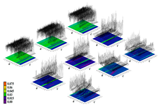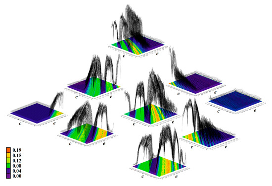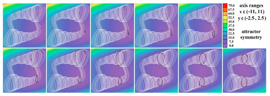 Figure 4, Figure 5, Figure 6, Figure 7, Figure 8, Figure 9 and Figure 10 demonstrate the distribution of dynamic energy through the state space for individual cases Ψ1–7 (see Table 1). Here, red color denotes high kinetic energy, green marks average local energy and magenta indicates a very low local energy. Numerical values associated with these rainbow scaled plots normalized to unity time intervals are also provided. Initial conditions and time step were kept the same as for the analysis given in Figure 2; both with integration input parameters and a set of the initial conditions. Firstly, note that strange attractors occupy different sized volumes in the state space. Therefore, each plotted high-resolution plane has different axis ranges but uniform step size 0.01; concrete boundaries can be found within descriptors of the individual figures. For system cases Ψ1 and Ψ4, it is obvious that average dynamic energy rises with the absolute value of state variable z. Using visualized plots, geometrical similarity between system cases Ψ1 and Ψ4 can be observed. Finally, strange attractors primarily do not evolve within areas with very high or low normalized energy. Along with kinetic energy distributions, Poincaré return maps for the horizontal slices of the state space (z = const) are visualized. Obviously, geometrical shapes of generated strange attractors are distinct and attractors are dense in the state space, outside regions of a high local differential growth. If indicated in the plot, vector field symmetry causes the strange attractor to be mirrored with respect to the zero plane (z = 0) and Poincaré sections could only be provided for upper or lower half state space (system cases Ψ2,3,6).