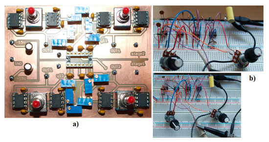 Photos captured during experimental investigation: (a) PCB showing two two-ports where transconductances y12 and y21 are polynomials up to the fourth-order, (b) two views onto breadboard with designed chaotic oscillator based on generalized class C amplifier.