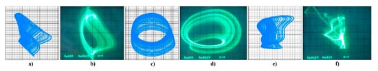 The core engine for all routines used for numerical analysis presented in this paper is a fourth order Runge–Kutta method with fixed step size. The numerical integration of both mathematical descriptions of the discovered chaotic system, i.e., matrix expression (1) and its normal form, calculated in Mathcad is provided by means of Figure 2. For this fundamental analysis, final time was set to 10,000 s, time step was 0.01 s, initial conditions were chosen x0 = (−1, 0, 0)T for parameter set Ψ1,2,3,5,6 and x0 = (2, 0, 0)T for parameter set Ψ4. Individual cases of parameters Ψ1–6 are associated with Table 1.