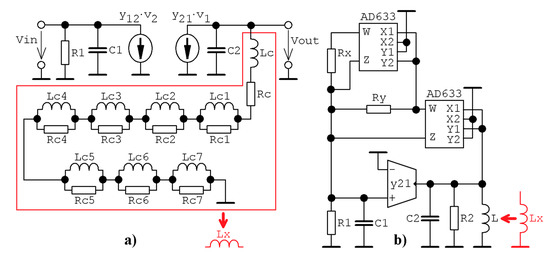 Two alternative lumped circuitry implementations of class C potentially chaotic amplifier: (a) principal schematic of dynamical system with passive approximated fractional-order inductor, (b) realization based directly on the state model (20).