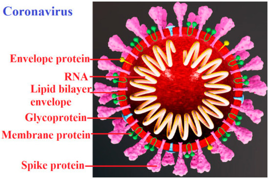 Virus particles (virions) can be viewed as nanoparticles (Figure 1); however, viruses are built of biopolymers (nucleic acids and proteins) and other organic components such as lipids. These organic compounds are sensitive to environmental conditions. Many viruses, such as coronaviruses, are inactivated at temperatures of 55–60 °C [10,12]. From a thermodynamic point of view, virions are mesoscale structures. With a typical linear size between 20 nm and 300 nm, they are much larger than a typical atomic scale, but they are still much smaller than macroscale structures because their molecular masses (usually ranging between 106 Da to 109 Da) are much smaller than the Avogadro number (NA = 6.08 × 1022). As far as their genetic information, the genome of one of the smallest porcine circovirus (17 nm) is built of 1760 base pairs, whereas that of the largest Pandora virus (micron-sized) is built of 2.8 × 106 base pairs.