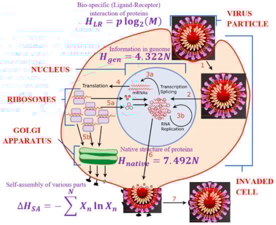 Fourth, the virus should invade a living cell using the cell’s receptor proteins, which would grant its entrance into the cell. Such receptor proteins should fit the membrane protein of the virus, causing a bio-specific reaction. At this stage, the information content reduction is characterized by .