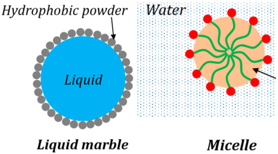 Micelles are nanometer-scale structures formed in a colloidal system when surfactant molecules arrange themselves into a spherical structure. Surfactants usually have a hydrophilic or ionic head and a hydrophobic–aliphatic tail. As surfactants are added to a colloid, the surface energy of the interface between the phases continues to decrease. Once surfactants reach a critical concentration (called critical micelle concentration), they can spontaneously agglomerate so that their heads are all arranged toward one phase of the colloid, and their tails toward the other phase. When the size of the surfactant molecules are within a favorable limit, the agglomeration results in a spherical structure [40]. Powder-coating modifies the surface energy of liquid marbles, while surfactants do the same for micelles. The formation of liquid marbles and spherical micelles is driven by the minimization of surface energy.