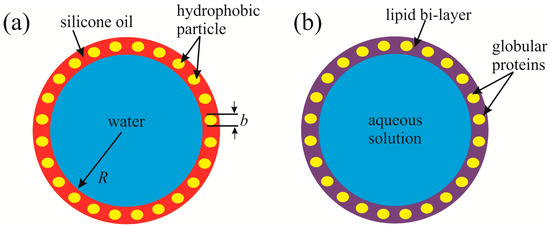 Bi-liquid, core-shell, or composite marbles, i.e., water marbles coated with a thin layer of oil comprising solid hydrophobic particles, were introduced recently [41,42,43]. The structure of the external interface of a composite liquid marble resembles that of living cells or virus membranes, built of lipid bilayers (including cholesterols) and containing intrusions of globular proteins and fragments of the cytoskeleton (Figure 4a,b). In both composite marbles and living cells, water is enveloped by a hydrophobic layer filled by heterogeneities.