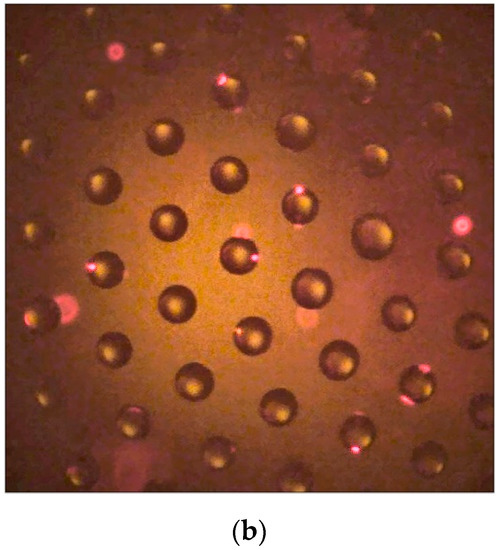 Another amazing self-assembled water object is the droplet cluster, consisting of condensed droplets in the range of about 10–100 µm in size levitating over an ascending vapor-air flow and self-assembling into a regular hexagonally symmetric (honeycomb-like) structure [45,46]. Interactions that control the self-assembly of the droplet cluster are water phase transitions (condensation and evaporation) and aerodynamic forces from the flow of a mixture of water vapor and ambient air [47]. The water cluster can be used for in situ monitoring of airborn microdroplets containing small biological objects [48,49]. Thus, living cells are adsorbed at the liquid–gas phase interface due to hydrophobic forces, which are also crucial for the cell membrane (Figure 5).