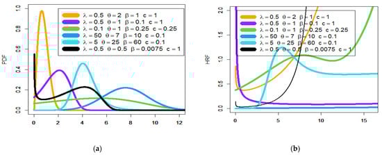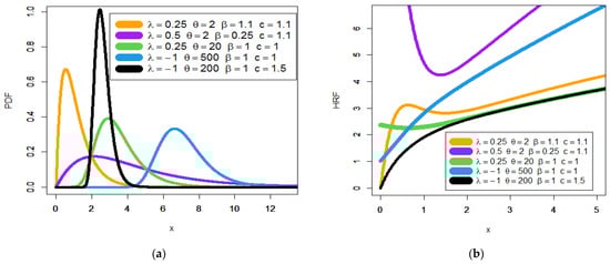 Plots of the PGEPII probability density function (PDF) (a) and PGEPII hazard rate function (HRF) (b).
