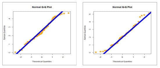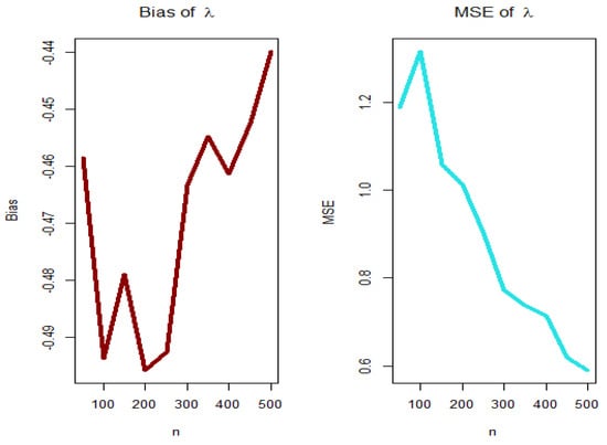 Note that refers to the gamma function and refers to the incomplete gamma function. Figure 1 gives some plots of the Poisson generalized exponential-Pareto type II (PGEPII) PDF (a) and PGEPII hazard rate function (HRF) (b) for some carefully selected parameters value. Figure 2 presents some plots of the Poisson generalized exponential-exponential (PGEE) PDF (a) and PGEE HRF (b) for some carefully selected parameters value. Based on Figure 1a, it is noted that the PDF of the PGEPII can be “asymmetric right-skewed function” and “symmetric” with different shapes. Based on Figure 2a, it is seen that the PDF of the PGEE can be “asymmetric right-skewed function”, “asymmetric left-skewed function”, “bimodal”, and “symmetric” with different shapes. Based on Figure 1b, it is noted that the HRF of the PGEPII can be “upside down bathtub ()”, “bathtub ()”, “decreasing-constant ()”, “increasing-constant ()”, and “increasing ()”. Based on Figure 2b, it is noted that the HRF of the PGEE can be “bathtub ()”, “decreasing-constant ()”, “upside down bathtub ()”, “constant ()”, and “increasing (J-shape) ()”.