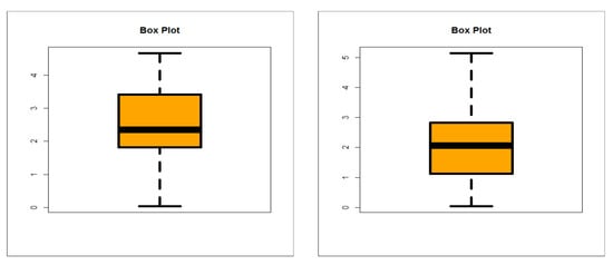 Let be an RV having the exp-G family power with and be an RV having the PGE-G family. Then, the rth moment of the RV is Analogously, the nth moment around the arithmetic mean () of is