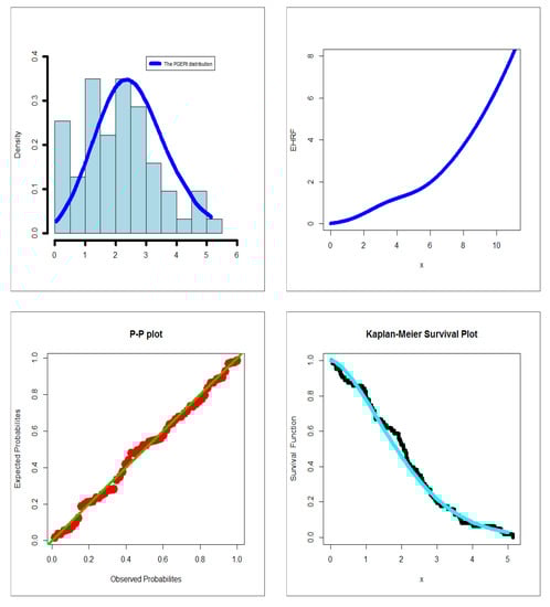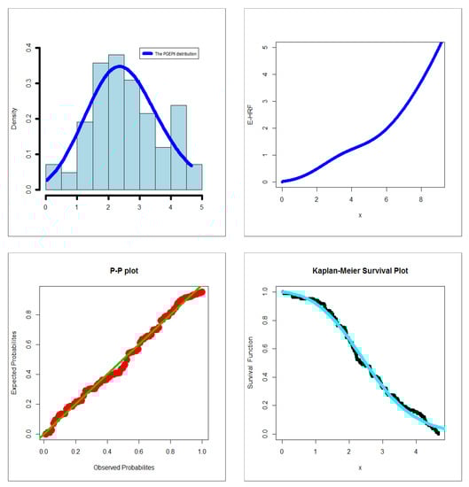 However, many other PII extensions could be considered in comparisons [,,,,,,,,]. For failure times real-life data, relevant numerical results are shown in Table 5 and Table 6. Precisely, Table 5 gives the MLEs and SEs. Table 6 gives the four GOF test statistics. For service times real-life data, the results are presented in Table 7 and Table 8. Precisely, Table 5 gives the MLEs and SEs, whereas Table 8 gives the four GOFs test statistics. Figure 11 and Figure 12 give the probability-probability (P-P) plot, estimated PDF (EPDF), Kaplan-Meier survival (KMS) plot and estimated HRF (EHRF) plot for the two datasets, respectively. Based on Table 6 and Table 8, it is noted that the PGEPII model gives the lowest values for all test statistics, where AICr = 264.231, CAICr = 264.737, BICr = 273.954, and HQICr = 268.139 for the first dataset, and AICr = 205.252, CAICr = 205.941, BICr = 213.824, and HQICr = 208.623 for the second dataset among all fitted models. Hence, it could be chosen as the best model under these criteria.