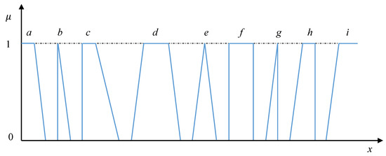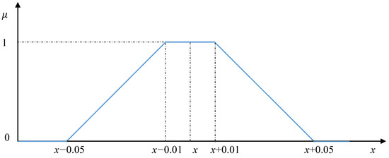 The matrix of pairwise comparisons presented in Table 3 was used as a real-valued basis. Further, all elements of this matrix were replaced with fuzzy numbers. The average values x of fuzzy numbers were equal to the values of the elements of the original matrix. The fuzzy values in all cells of the matrix had the same maximum width equal to 0.1 (Figure 4).