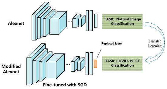 In the original Alexnet, the last layer contains 1000 neurons corresponding to the 1000 natural image classes. As our COVID-19 diagnosis work is a binary classification task, we modify the Alexnet to adapt to our task. We replace the last layer of AlexNet using our layer with two neurons to output the binary diagnostic result, as illustrated in Figure 3.
