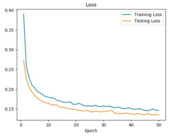The loss on training and testing sets with the increase of epoch. At the beginning of the training phase, the model is relatively poor with high loss; then the loss decreases rapidly; then the model is improved gradually and at last it converges. Notice that the testing loss is lower than the training loss. The reason is that we used dropout strategy in the training phase, which was not included in the testing phase.