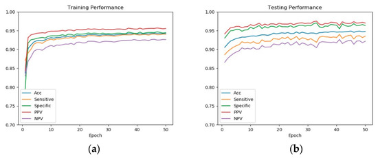 Furthermore, we recorded the classification performances of the intermediate states of the model in each epoch. Five widely used criteria of classification performance were used: classification accuracy rate (ACC), sensitivity, specificity, positive predictive value (PPV), and negative predictive value (NPV). Let , , , and be the number of true positives, true negatives, false positives, and false negatives, respectively. Then the ACC, sensitivity, specificity, PPV, and NPV are measured as Equation (1) to Equation (5), respectively. The results on training set and testing set with the increase of epoch are shown in Figure 5.