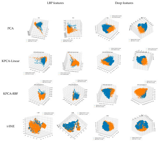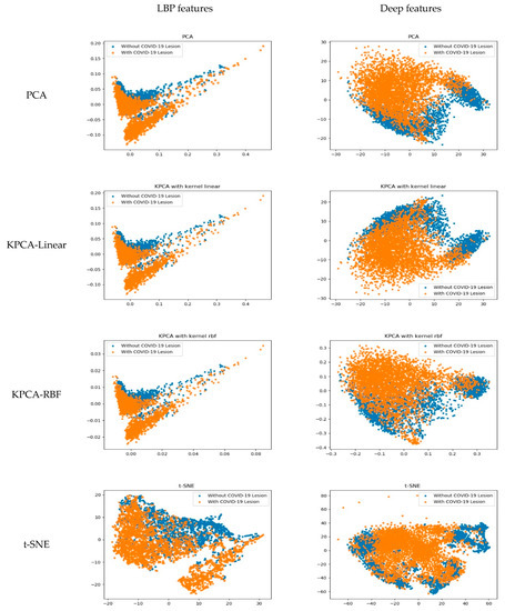 For the KPCA method, we employed two typical kernels in our experiments, namely the linear kernel and radial basis function (RBF) kernel. In Figure 6 and Figure 7, the four rows correspond to the results of PCA, KPCA-Linear, KPCA-RBF, and t-SNE, respectively. In each subgraph, the scatters in orange or blue colors denote the CT images with COVID-19 lesions or without COVID-19 lesions, respectively. From the 2-D visualization results in Figure 6, we can see that the deep features are more discriminative than the LBP features, which is demonstrated by the result of each dimensional reduction method. The scatters of LBP features are mixed together heavily, while that of the deep features are separable on the whole. This conclusion is confirmed by the 3-D results in Figure 7. In Figure 7, for the 3-D result of each method on each feature type, we picked two representative perspectives and displayed them. We can see that in the 3-D space, the deep features are more discriminative than the LBP features.