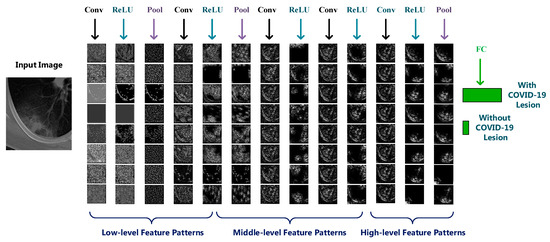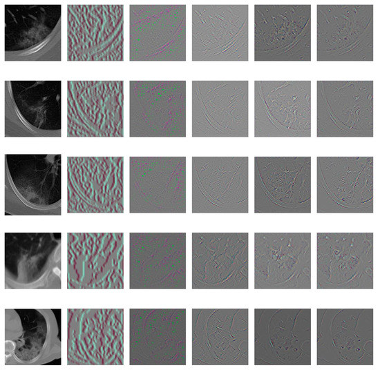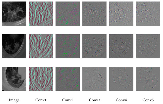 We visualized the learned patterns of the hidden layers [53] in Figure 9 and Figure 10. In Figure 9, we visualized the results of each layer of the modified Alexnet model on an example image infected with COVID-19. In each layer, eight neurons were randomly selected for visualization. In Figure 10, we visualized the results of the five hidden convolutional layers of Alexnet on eight example images infected with COVID-19. In each layer, one neuron was randomly selected for visualization. To clearly show the patterns, we generated the color images in Figure 10. In the experiments of Figure 9 and Figure 10, the example images were selected randomly.