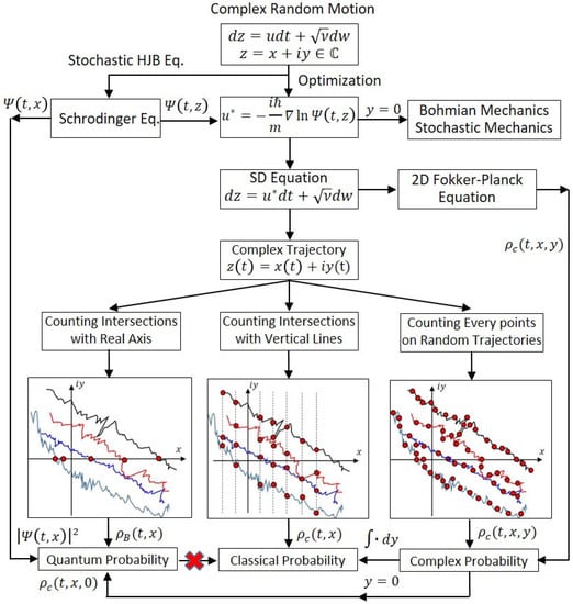 In conclusion, we used complex random motion to integrate quantum probability, classical probability, and complex probability. It was demonstrated that the three probability measures can all be established by the distribution of a particle’s random positions in the complex plane, and the difference between them is only in the way of counting the particle’s positions. As shown in Figure 1, the quantum probability counts the number of times that the complex trajectories intersect the real axis at a certain point ; the classical probability counts the number of times that the complex trajectories intersect a certain vertical line (); and the complex probability counts the number of times the complex trajectories pass a certain fixed point in the complex plane. After we establish the complex probability , we can integrate with respect to to obtain the classical probability , and we can evaluate at to obtain the quantum probability . Only by defining probability in the complex plane can we see the difference between the quantum probability and the classical probability .