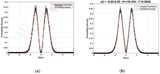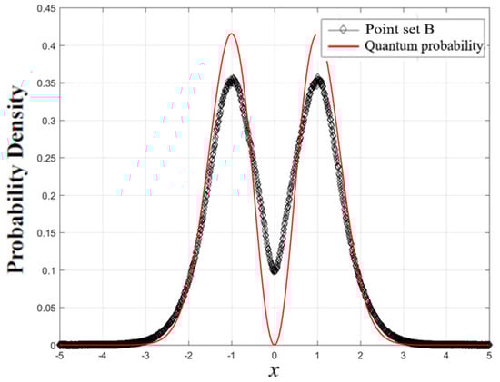 From Equation (49), we can see that there are two equilibrium points, , which correspond to the two peaks of the quantum probability , denoted by the solid red line in Figure 2b. The CQRT is obtained by integrating Equation (49) with respect to time. The probability distribution formed by the ensemble of the CQRTs is illustrated in Figure 2b. To compare this probability distribution to the quantum probability, we collect all intersections of the CQRTs and the axis, which is called point set A,
