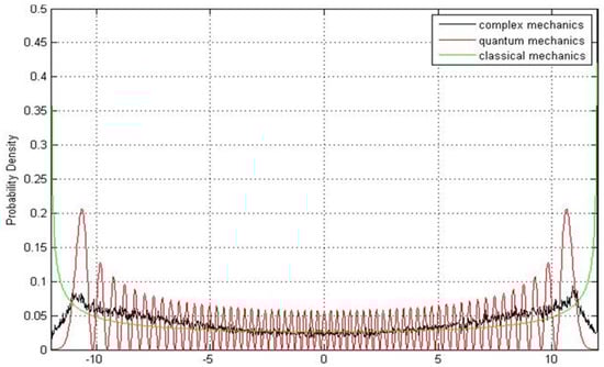 It can be seen that point set A is a subset of point set B with . The statistical distribution of in point set B is demonstrated together with (i.e., point set A) in Figure 3. Apparently, the two distributions are distinct near the nodes . In terms of the trajectory interpretation, the nodes are formed with zero probability, indicating that point set A is empty when it is evaluated at , as shown by the red curve in Figure 3. However, point set B is not empty when evaluated at due to the inclusion of the extra points with non-zero imaginary part . The two different ways of collecting the data points cause the discrepancy between the distributions of the two point sets near the nodes. The significant contribution made by including extra complex points in point set B is that the statistical distribution of in point set B converges to the classical probability distribution as the quantum number is large, as shown in Figure 4, where point set B is generated by the CQRTs solved from Equations (44) and (45) with . On the contrary, if point set A is generated from the same ensemble of CQRTs, its statistical distribution, i.e., the distribution of , shows the existence of 60 nodes located along the real axis, which is remarkably different from the classical distribution, as shown by the green curve in Figure 4. Therefore, the extension of quantum probability to the complex plane is crucial to the applicability of the correspondence principle.