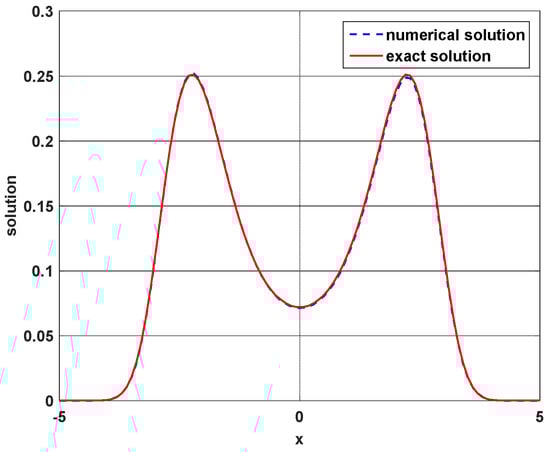 Figure 5 displays the exact solution (57) and the finite difference solution to Equation (58). The consistent result indicates that our finite difference algorithm works very well.