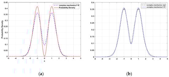 The numerical result is shown by the blue dashed curve in Figure 7a, where we can see that the node at for does not appear in the solution to Equation (64). This means that the probability of finding a particle at the node is not zero. It is because a particle moving in the complex plane can bypass the node through another point with non-zero imaginary component . Figure 7b shows that the numerical solution to the complex FP Equation (64) is consistent with the statistical distribution of point set B, which is generated by the CQRTs solved from the complex SD Equations (62) and (63). Both curves in Figure 7b show a non-zero probability of finding a particle at the node .