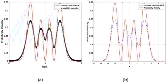 (a) The red solid line is the quantum probability and the black dotted line is the statistical distribution of point set B generated by CQRTs for state. (b) Comparison of the solution of the complex FP equation (blue dashed line) to the quantum probability (red solid line). The initial probability is assigned as . The boundary conditions are and .