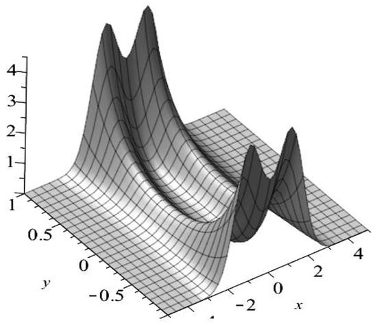 So far, our attention to quantum probability has focused on the real axis. In complex mechanics, quantum particles move randomly in the complex plane, and the probability distribution of their locations must be expressed in the complex plane instead of the real axis. Figure 9 illustrates the probability distribution over the complex plane solved from the complex FP Equation (64). The inset in the figure shows the contour plot of , from which we can see that the joint probability reaches peaks around the points and and declines to the node at . The 3D plot of manifests that when , approaches zero, which means that a particle in the state is bound along the real axis as well as the imaginary axis and will not be too far from the origin. By contrast, quantum probability only concerns particles on the real axis, so it only provides the probability distribution along the axis.