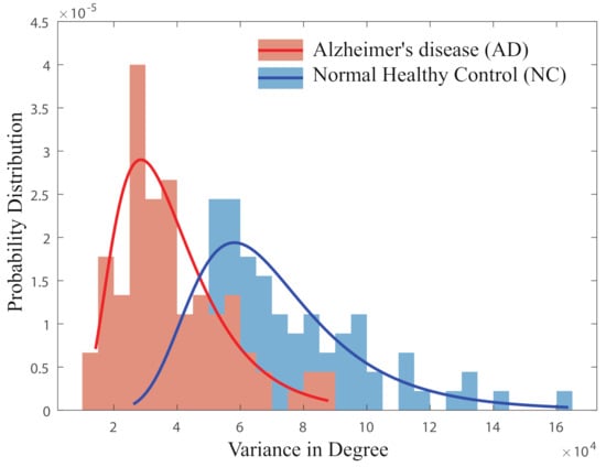 Taking this analysis further, we explore whether the degree variance in the microcanonical ensemble and the nodal entropy in the canonical ensemble can be combined as features to classify patients in the Alzheimer’s disease study. We first consider the node degree variance in the microcanonical ensemble networks. Since brain networks in this category have the same number of edges and nodes, the values of temperature are identical for all fMRI networks. To distinguish the fMRI network structures in AD and normal people, we plot the distribution of degree variance in Figure 2. This shows that the brain networks in AD occupy the lower range of node degree variance compared to the normal subjects.