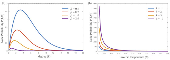 The node probability varying with the degree k and inverse temperature in Equation (21). (a) node probability with degree; (b) node probability with inverse temperature.