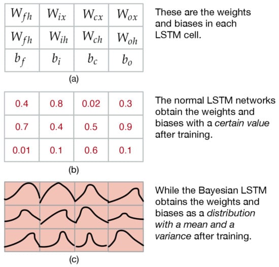 The difference between the normal LSTM network and the Bayesian LSTM network. (a) The parameters in the LSTM; (b) the example of the parameters in the normal LSTM; (c) the example of the parameters in the Bayesian LSTM.
