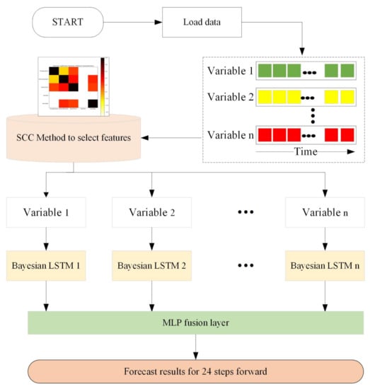 The selection node calculates the series causality of the data source and selects the variables related to the target data as the network input. For each selected input variable, a Bayesian LSTM sub-predictor is designed. Finally, we use the fusion node to fuse the prediction results of multiple sub-predictors. An artificial neural network MLP is used in the fusion node. MLP is a fully linked combination of artificially designed neurons, which applies a nonlinear activation function to model the relationship between the input and output.