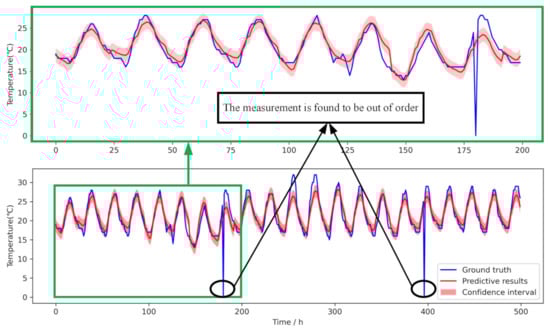 From the actual measurement data, the prediction model’s input data caused by sensor failure give the wrong measurement value. We can see that in the bottom picture, the sensor is out of order in two hours, in which the sensor measurement data are zero. However, the prediction result effectively overcomes the sensor’s failure and gives a daily temperature trend consistent with historical data. However, the prediction result still maintains the correct trend, which effectively overcomes the sensor failure.