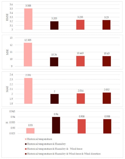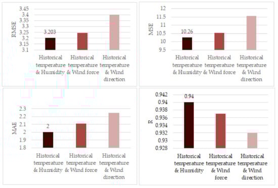 Table 4 and Figure 7 show the comparison results with two inputs. It can be seen from Table 4 that when historical temperature and humidity are set as the input, the best prediction performance can be obtained, in which the RMSE, MSE, and MAE are 3.203, 10.260, and 2, respectively. Compared with other combinations of input, such as historical temperature and wind force and historical temperature and wind direction, the RMSE, MSE, and MAE decreased.