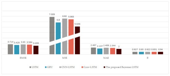 In this case, we compared other deep network models with the methods proposed in this paper. Among them, no baseline models included a feature selection process and used all features as the network input. As shown in Table 6 and Figure 9, the RMSEs of LSTM [], GRU [], CNN-LSTM [], conv-LSTM [], and the proposed Bayesian LSTM were 3.714, 3.429, 3.630, 3.594, and 3.203 and the MSEs were 13.797, 11.759, 13.174, 12.915, and 10.260, respectively. The MAEs were 2.467, 2.137, 2.406, 2.344, and 2.000, respectively. Compared with LSTM and GRU, the RMSE of the proposed Bayesian LSTM decreased by 13.76% and 6.59%, and the MSE decreased by 25.64% and 12.75%, while the MAE decreased by 18.93% and 6.41%, respectively. Compared with other hybrid models, such as CNN-LSTM and conv-LSTM, the results show that the Bayesian LSTM was the best, obtaining the minimum RMSE of 3.203 and the least MAE of 2.000. Therefore, the Bayesian LSTM can better fit the data and had the best prediction performance.