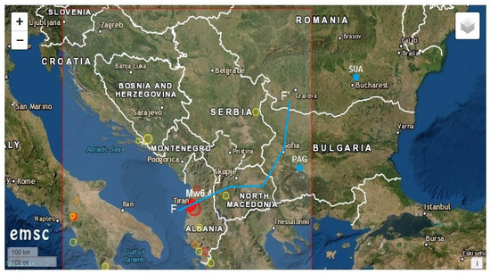 The placements of the Mw6.4 earthquake (red full circle), the geomagnetic observatories Panagjurishte (PAG), Bulgaria and Surlari (SUA), Romania (blue marks) and F-F’ profile (blue line) on the Euro Mediterranean Seismic Centre (EMSC) map.