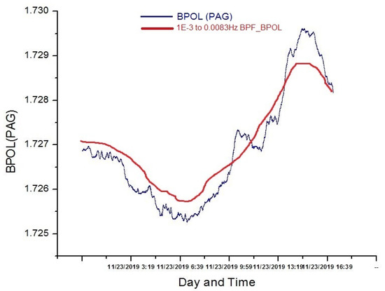 FFT (fast Fourier transform) band-pass filtering (red line) applied on BPOL (PAG) (geomagnetic polarization parameter) distribution for a time window of 1024 samples (∆t = 60 s), recorded on 23 November 2019.