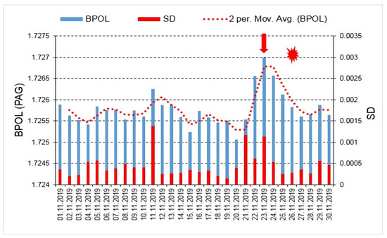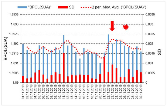BPOL (SUA) and its standard deviation (SD) time series carried out on the interval 1–30 November 2019; for additional information see Figure 4 caption.