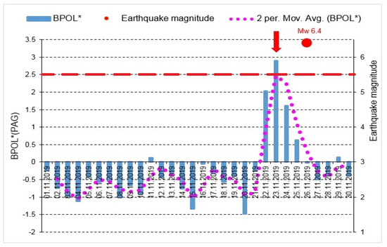 BPOL* (PAG) time series carried out on the interval 1–30 November 2019; vertical red arrow indicates a pre-seismic anomalous signature on 23 November, 2019; red full circle is Mw6.4earthquake; dotted pink line is 2 days averaged distribution of BPOL*; red dashed line is threshold for anomaly using standard deviation (SD).