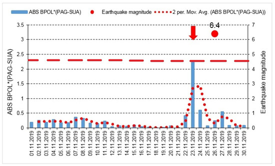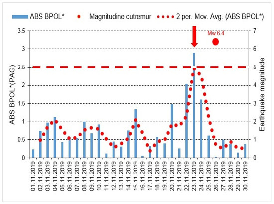 - A precursory signature associated to the above-mentioned earthquake was identified on the BPOL* (PAG) and ABS BPOL* (PAG) time series carried out on the interval 1–30 November, using a statistical analysis based on Relation 3, and the results are emphasized in Section 3.2, Figure 6 and Figure 7. On the both BPOL* (PAG) and ABS BPOL* (PAG) time series an anomalous interval, extended between 22 and 24 November, with a maximum value of 2.5 (Figure 6 and Figure 7), was identified with 3 days before the Mw6.4 earthquake occurrence.