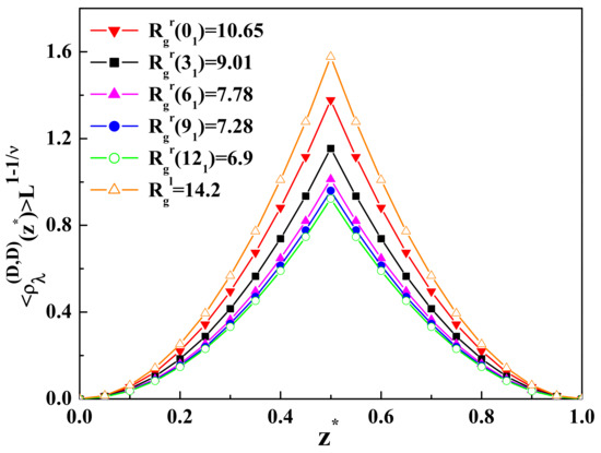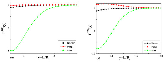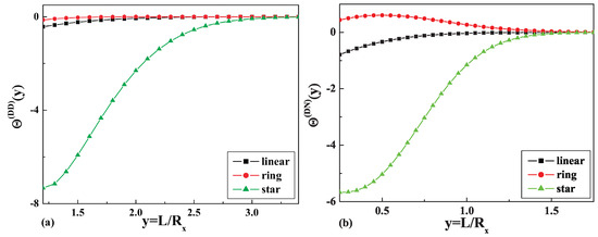 The most common parameter in polymer physics to denote the polymer chain size that is observable in experiments is the radius of gyration . For example, for linear polymer chains, the following relation takes place: , where is a universal numerical prefactor depending on the dimension d of the system (see Refs. [78,79,80]), and is the projection of the end to end distance onto the direction of the x axis. In the case of ideal polymer chains, one has , and for , in the case of ideal ring polymer chains, the following relation takes place: , which can be rewritten formally in the form in order to keep similar notations as for linear polymer chain [65]. The mean-squared radius of gyration for star polymer chains is [81]: