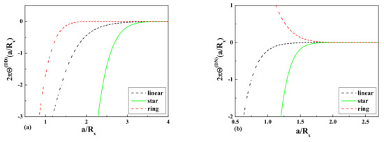 The dimensionless values of the depletion interaction potentials: (a) and (b) for the case of a linear, a ring, and a star polymer with four arms.