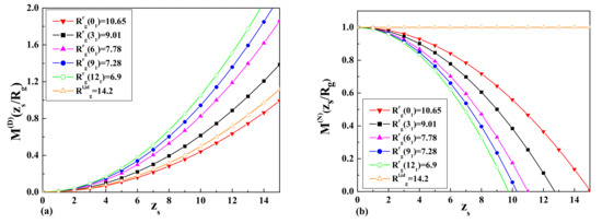 where , , and for the case of a dilute polymer solution of ring polymers between a wall and a big colloidal particle of radius R; for the case of two colloidal particles of different sizes with radius . It should be mentioned that the sign “−” in Equation (23) refers to the case of two repulsive surfaces with the D-D b.c., and the sign “+” corresponds to the case of one repulsive and one inert surface with the D-N b.c.
