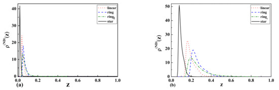 The comparison of the results Equations (44) and (45) obtained for the layer monomer density profiles of a dilute solution of star polymers with arms with the results obtained for ring polymers Equation (23) and linear polymers Equations (25) and (26) immersed in a solution of mesoscopic colloidal particles of a big size with different adsorbing and repelling properties with respect to polymers are presented in Figure 2a,b, respectively.