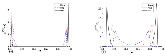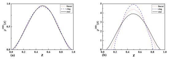 For the case of two repulsive walls with separation (wide slit), we observed that the monomer density profiles for star polymers are higher than the results for linear and ring polymers in the middle of the slit and near the walls (Figure 7a). As one can see from Figure 7b, the situation looks completely different in the case of a narrow slit. In this case, the monomer density profiles for ring polymers are higher than the results for linear and star polymers in the middle of the slit. This can be attributed to the different topologies of polymers, as well as their corresponding values. It should be mentioned that the behavior of the profiles near the walls is opposite.