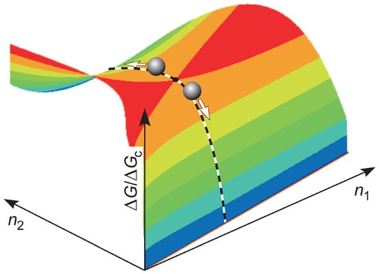 An illustration of the nucleation process in terms of the standard model used widely in classical nucleation theory (CNT) is given in Figure 1. The main ideas retain its importance if modifications of this model have to be accounted for as discussed, e.g., long ago by J. J. Thomson in analyzing condensation on electrically charged particles, or more generally, treating phase formation processes under the influence of electric and magnetic fields [8] or other factors modifying the most probable pathways in nucleation (see, e.g., in [9,10]). In any case, once a cluster has been formed exceeding the size of the critical cluster, the further evolution to the crystalline phase proceeds in accordance with macroscopic thermodynamic evolution laws.