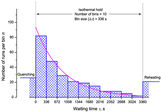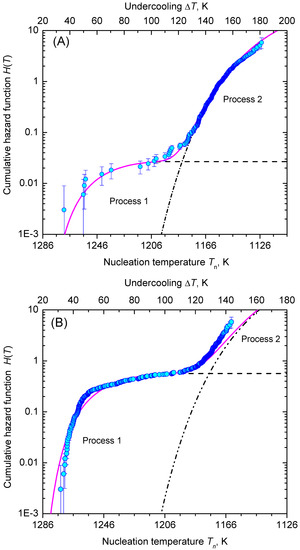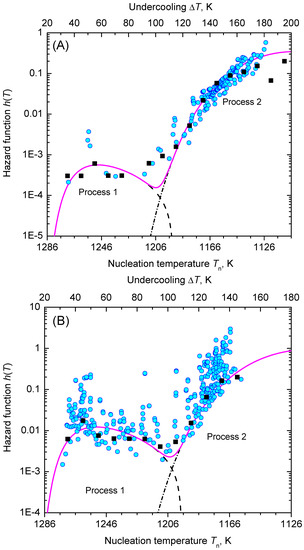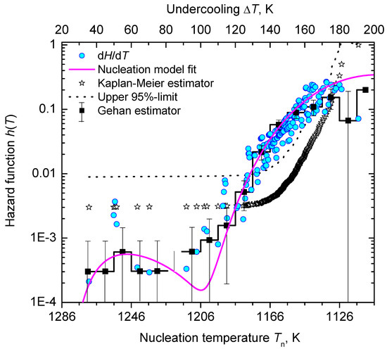 Alternatively, statistical analysis can start from the density distribution of nucleation events for estimating the lifetime and hazard functions. This approach, which was initially used in population census and death statistics and known as the life table method, can be of great value if all events are occurring within the trial period and the total number of events, , is not too small. However, a life table of crystal nucleation requires a divided time or divided temperature axis. In consequence, estimates of the hazard function lack smoothness and continuity as the events are collected within each interval (bin) with the bin size as a possible confounding factor. Despite these drawbacks, Figure 13 shows that the results obtained using Gehan’s estimator [75] (for a bin size of 10 K) and the differentiated cumulative hazard data coincide widely. In turn, it must be noted that from inspection of Figure 13 neither Gehan’s nor Kaplan–Meier’s method of directly estimating the hazard function, h, seems to be an adequate option to discover concurrent nucleation mechanisms. In such cases, the described route via a linearized representation of the cumulative hazard, i.e., vs. (see Figure 8), can be very effective to provide such a conclusive evidence.