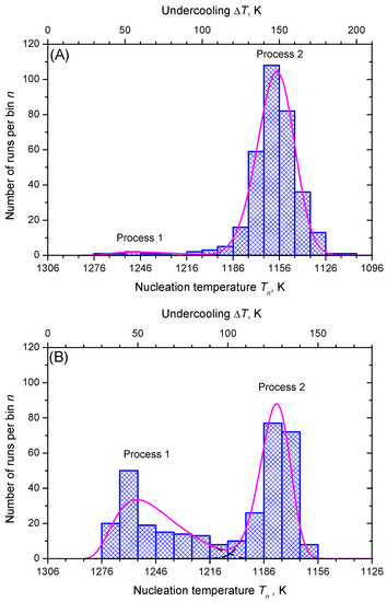 In CNT, the statistical nature of nucleation is reflected only partly by measuring the average number of nuclei formed per unit time in a unit volume and interpreting it via Equation (1). However, other methods may result in a more explicit description of the stochastic nature of nucleation supplying us not only with average values, but with distributions in time and/or temperature of crystal nucleation events. For example, to maintain a higher level of statistical significance, data are frequently accessed using two different experimental approaches. The first covers deeply undercooled liquids, whereas the second deals with liquids at shallow undercooling. In this context, it is considered appropriate that the nose temperature of the TTT-diagram representations assigns the threshold value of undercooling. Thus, statistically sufficient data are achieved by analyzing ensembles of crystals when heating from temperatures below the glass transition temperature in a single run of one or two stages (deep undercooling) [13,14,15,16]. In turn, multiple runs of the same sample are necessary if the liquid is undercooled from above liquidus temperature (shallow undercooling). The latter technique—the so-called statistical approach—has its foundation from the fact that the first nucleated crystal grows fast and consumes the entire liquid volume shortly [17].