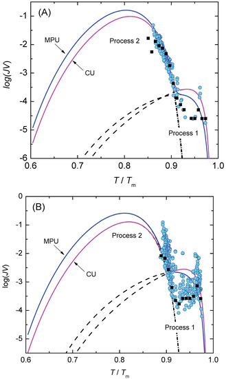 where j denotes the number of concurrent nucleation processes. Modifications of this relation can be advanced accounting for more correct expressions for the thermodynamic driving force [73] going beyond the Tammann–Meissner–Rie equation, the decoupling of diffusion and viscosity [74] or accounting for different mechanisms of how heterogeneous nuclei may act on crystal nucleation [23,27,51,52,53,54].