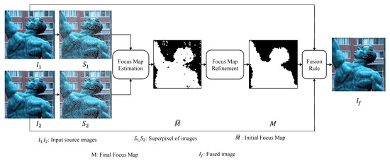 We propose a spatial domain based multi-focus image fusion algorithm that builds on the idea that pixels in a small locality in an image are highly autocorrelated—having similar colors and textures—and thus can be merged into larger patches known as superpixels to improve the speed and quality of different tasks. These superpixels are more expressive than single pixels as they carry more distinctive statistical properties when compared with other superpixels. Moreover, we observe that they have a greater tendency to be distinguished as focused and out-of-focused compared to single pixels. We exploit this important characteristic to design a novel and efficient image fusion algorithm. The proposed method works in three steps. First, superpixels in the source multi-focus images are computed. Second, using the statistical properties of superpixels, they are categorized as focused and de-focused, from which initial focus maps are constructed. The initial focus map is refined using a spatial consistency constraint. Third, the refined focus map is used to obtain the fused image from source multi-focus images with the help of a fusion rule. A schematic diagram of the proposed method is shown in Figure 2. These steps are described in detail in the following sections.
