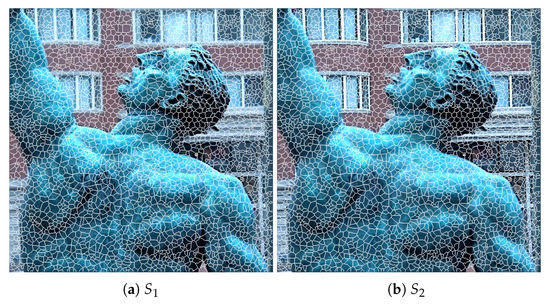 Let and be two source multi-focus images. In the rest of the text, they are simply referred to as source images. Using the proposed algorithm, the superpixels in are computed, which are mapped to to divide into the corresponding set of superpixels. That is, the superpixels in are not computed; instead, the superpixel labels computed in are assumed for as well, and the values of their centers are updated with respect to . This helps to establish the correspondence between the superpixels in and . We recall that both images are complementary and represent the same scene, but with different focused regions. Therefore, the superpixel structure of the two images is kept the same so that the correspondence between them can be established. Figure 3 shows the superpixels computed using the proposed strategy on a sample multi-focus image pair (shown in Figure 1).