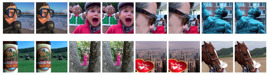 In this section, we evaluate the performance of the proposed multi-focus image fusion method and compare it with the existing MIF techniques. The performance was assessed both qualitatively and quantitatively, and various analyses were also performed to evaluate the robustness of the proposed method. The experiments were performed on the recent widely used Lytro multi-focus dataset [43,70]. The dataset contains 20 color multi-focused image pairs, each of size . Sample image pairs from the dataset are shown in Figure 7.